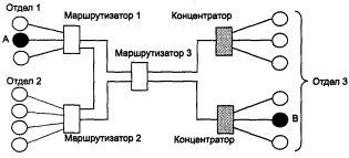 На рис. 2.14 показана сеть, построенная с использованием концентраторов. Пусть компьютер А, находящийся в одной подсети с компьютером В, посылает ему какие-то данные. Несмотря на разветвленную физическую структуру сети, концентраторы распространяют данные по всем ее сегментам. Поэтому данные, посылаемые компьютером А компьютеру В, хотя и не нужны компьютерам отделов 2 и 3, в соответствии с логикой работы концентраторов все равно поступают на сегменты и этих отделов тоже. И до тех пор, пока компьютер В не получит адресованную ему информацию, ни один из компьютеров этой сети не сможет передавать данные.