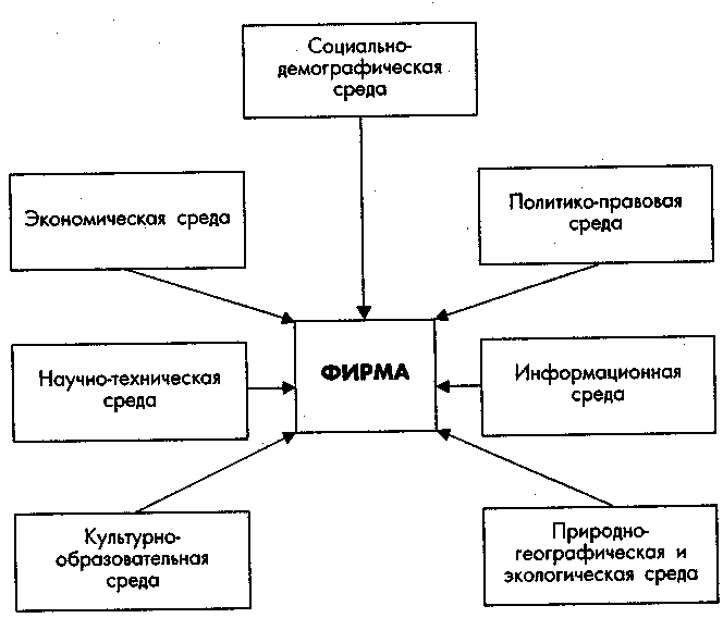 Макросреду маркетинга образует совокупность сил и факторов, оказывающих глобальное влияние на рынок в целом и соответственно на каждую фирму в отдельности.