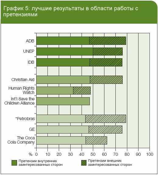 о всех секторах внутренние претензионные политики, такие как политики реагирования бдительных граждан, обладают высоким качеством. ПРООН, ЮНЕП и Международная продовольственная программа применяют все принципы хорошей практики, такие как отказ от преследования и конфиденциальность. Внутренние системы работы с претензиями также хорошо развиты в 20 из 30 организаций, набравших больше 70%.