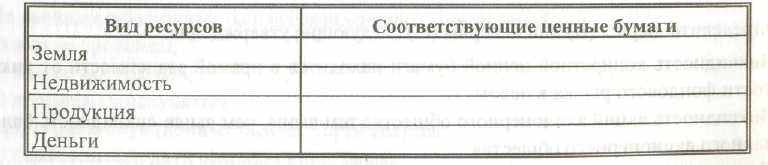 1. Каждому виду материальных ресурсов соответствуют конкретные ценные бумаги. Заполните таблицу, внеся соответствующие определенным видам ресурсов ценные бумаги.