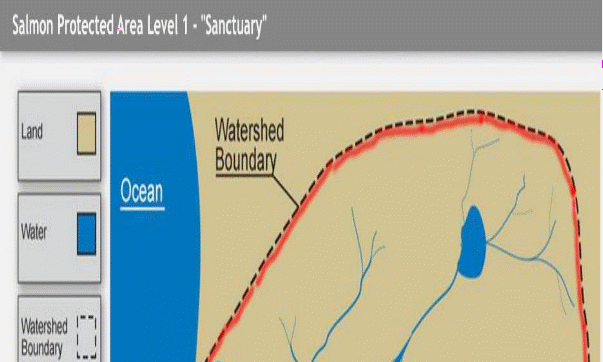 | | Зоны развития молоди, ключевые водоразделы | Первичные меры по охране лососей. Допустимы временные лесоразработки и строительство дорог. Нормальная среда обитания по всему бассейну, возможна охрана более 1 вида лососевых. IUCN IV. Пример: «Клинтон Форест План» (США). IUCN IV. |