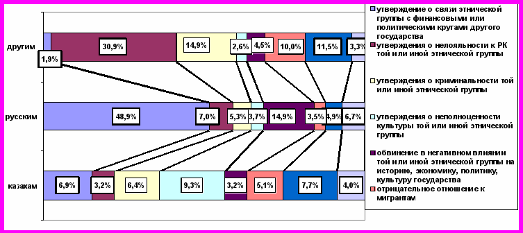 Кроме того, с телеэкранов, из радиоэфира, со страниц газет и журналов ежедневно на молодых людей воздействует информация, которая зачастую подается языком конфронтации, причем ее транслируют не только СМИ, но и эксперты, ученые, воспроизводя в общественном сознании дискриминационные практики2. Таким образом, духовно-нравственная атмосфера модернизирующегося общества создает не самую лучшую ситуацию для распространения и утверждения в массовом сознании гуманистических ценностей. Проведенный социологический опрос показал, что средства массовой информации Казахстана воспроизводят, а значит, и внедряют в сознание людей различного рода негативные этнические стереотипы (диаграмма 3).