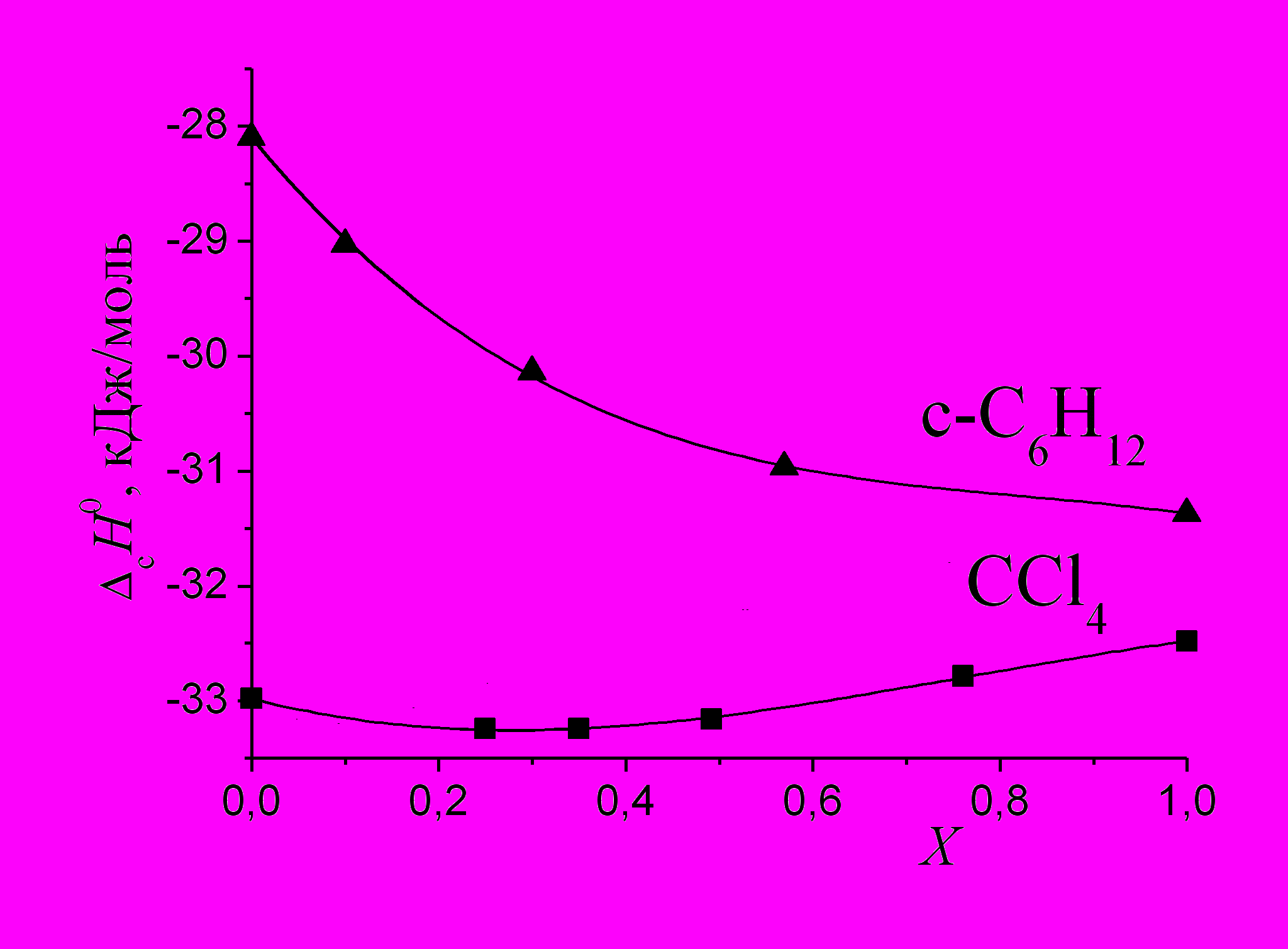 (2)На рис. 3 показаны энтальпии сольватации ССl4 в бинарном растворителе метанол - 1-бутанол, рассчитанные по соотношению (1) с использованием (2). Для сравнения приведены энтальпии сольватации циклогексана системой метанол - 1-бутанол*. Видно, что по отношению к циклогексану, неспецифически взаимодействующему с растворителем, 1-бутанол обладает большей сольватирующей способностью, чем метанол. По отношению к ССl4 большей сольватирующей способностью обладает метанол, кислотные свойства которого наиболее выражены в ряду одноатомных спиртов. Экзотермичность сольватации циклогексана усиливается во всем интервале составов смеси метанол - 1-бутанол, тогда как экзотермичность сольватации ССl4 сначала несколько усиливается, а затем ослабляется. Это можно объяснить тем, что наряду со специфическим взаимодействием ССl4 (основание) – спирт (кислота) (см. рис. 1б) имеет место взаимодействие ССl4 (кислота) – растворитель (основание), величина которого изменяется с составом смешанного растворителя. Также можно предположить, что добавление к метанолу 1-бутанола разрушает Н-ассоциаты метанола, что приводит к усилению сольватации растворяемых соединений за счет уменьшения эндовклада образования полости и, возможно, за счет усиления неспецифического взаимодействия растворяемого соединения с тем спиртом, который имеет больший углеводородный радикал. Вероятно, совместным действием обоих указанных факторов объясняется усиление сольватации циклогексана во всем интервале составов смеси метанол - 1-бутанол.