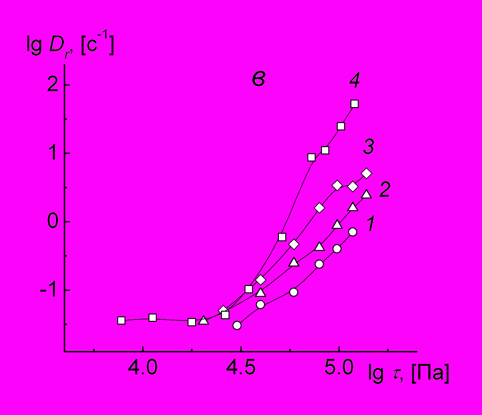 | Рис. 20. Кривые течения ОЦТС при различных температурах: а – ЦТС-Ме3: 1–80, 2–150, 3–185, 4–200С; б–ЦТС- Vi: 1–25, 2– 80, 3–150, 4–200С; в – ЦТС-CH2Cl: 1–60, 2–100, 3–150, 4–200С. | ||