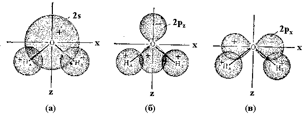 Рис.4. Перекрывание 2s- (а), 2px- (б) и 2pя- (в)орбиталей атома кислорода с 1s-орбиталями двух атомов водорода молекулы воды.