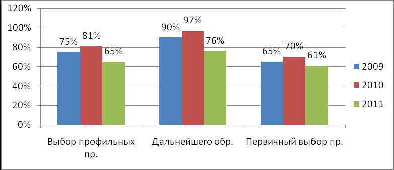Наряду с этим не все запросы обучающихся по изучению предметов на профильном уровне удовлетворяются вследствие того, что: не реализуются элективные курсы прикладной направленности; недостаточное удовлетворение образовательных потребностей обучающихся в изучении профильных предметов по выбору на уровне школы; недостаточное использование педагогическими работниками современных педагогических технологий, востребованных профильным обучением, способствующих повышению качества знаний обучающихся, развитию учебных и внеучебных достижений; отсутствие системы профориентационной работы с обучающимися 1 - 11 классов через совместную деятельность представителей образовательной и социально-экономической сфер города. Решение данных проблем возможно с созданием условий для сетевого взаимодействия образовательных учреждений через создание муниципальной сети, разработку и внедрение муниципальной программы профориентационной работы, повышение профессиональной компетентности педагогов. Данная работа уже начата и будет реализовываться в 2011 – 2012 учебном году на уровне эксперимента.