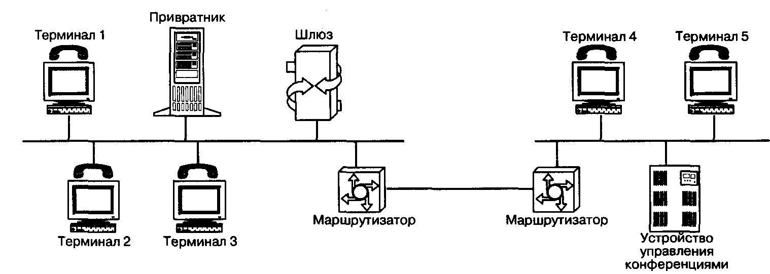 цессоров для обработки пользовательской информации (Multipoint Processor - МР). Контроллер может быть физически совмещен с привратником, шлюзом или устройством управления конференциями, а последнее, в свою очередь, может быть совмещено со шлюзом или привратником.
