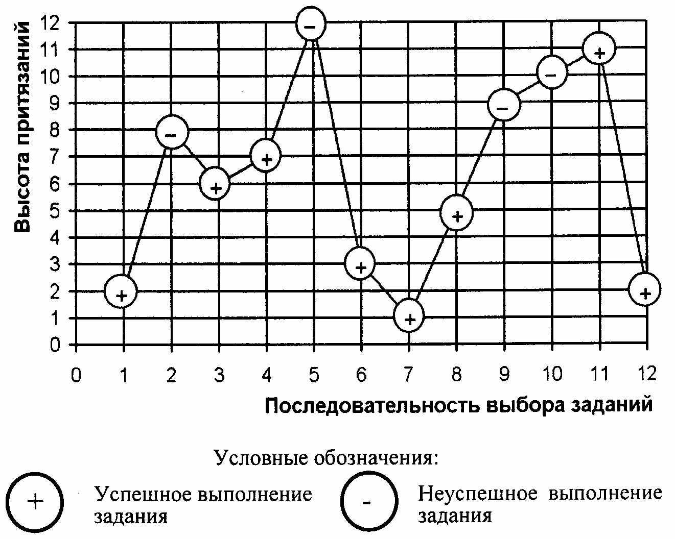 Неустойчивость притязаний была характерна как для неречевого, так и для речевого его компонента. Вместо легкой динамики в выбранной для работы зоне сложности, характерной для уравновешенной, гармоничной, целеустремленной личности, для заикающихся был свойственен хаотичный, дезорганизованный выбор заданий, проявляющийся порой в отсутствии адекватной связи между выбором последующего задания и успехом или неудачей в решении предыдущего. В результате у большинства пациентов график уровня притязаний (как неречевого, так и речевого компонентов) представлял собой пилообразную кривую с наличием очень резких спадов и подъемов. Причем для речевого компонента уровня притязаний был характерен больший размах амплитуды (большее количество скачков), большая величина шага понижения при неуспешном выполнении речевого задания и меньшая величина шага повышения при успешном выполнении задания, чем при исследовании неречевого компонента. Это говорит о более болезненной реакции пациентов на неуспех в связи с тем, что исследование проводится на вербальном материале и успех в выполнении заданий является для заикающихся подростков и взрослых личностно значимым, в связи с чем д