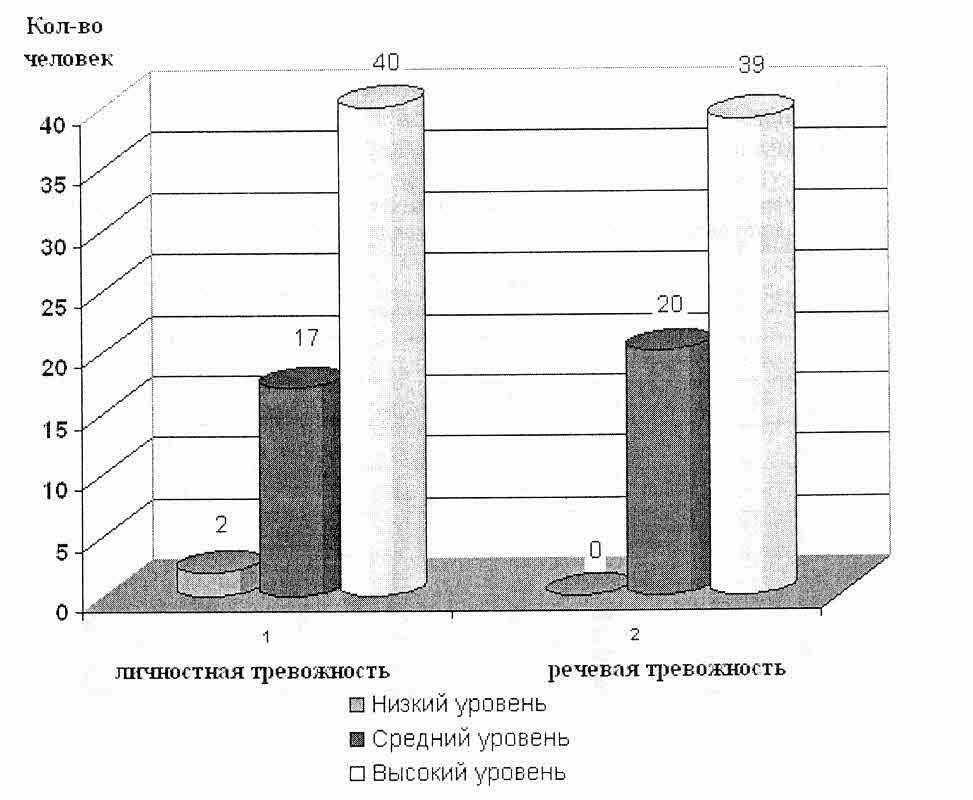 Наряду с этим у заикающихся данной группы было выявлено преобладание высокого уровня личностной тревожности (по методике Ч.Д. Спилбергера) и речевой тревожности (по методике Р. Эриксона в адаптации В.А. Калягина — Л.Н. Мацько). Совпадение уровня речевой и личностной тревожности у большинства заикающихся показывает, что наличие речевого дефекта затрагивает не только речевую сферу заикающихся (речевые уловки, избегание речевых контактов, уход от трудных речевых ситуаций, как, например, разговор по телефону), но и приводит к изменениям некоторых личностных свойств, в частности, появлению тревожности как черты характера.