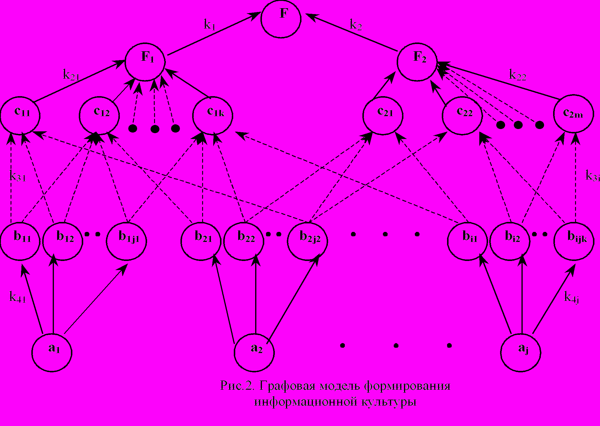Графовая модель определения эффективности использования дисциплин при формировании информационной культуры студентов технических специальностей. Пусть начальными узлами aj являются учебные дисциплины: высшая математика, химия, история, философия, физика, информатика, сопротивление материалов, теоретическая механика, иностранный язык, экология, которые изучаются студентами младших курсов технических специальностей. Промежуточные узлы bij - темы соответствующих дисциплин; c1k , c2m – знания, умения, навыки, соответствующие компонентам информационной культуры (F) – информационной грамотности (F1) и компьютерной грамотности (F2). (рис. 2)