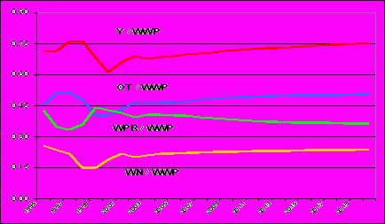 При расчетах вариантов развития в сценарии исходных данных модели закладываются различные уровни оплаты и производительности труда, затем на промежутке в 15 лет (с 2006 по 2020 гг.) наблюдается прогноз показателей модели. В одном из вариантов прогноза предполагалось, что меняется только траектория коэффициента средней оплаты труда. Последовательно повышалось конечное значение этого коэффициента (в 2020 г.) от величины 2,336 до величины 3,396. Вычислялись все эндогенные показатели модели и анализировалось поведение основных показателей: базисного темпа конечного потребления домашних хозяйств, базисного темпа ВВП, базисного темпа инвестиций, количество мигрантов, производственных мощностей и других показателей. В таблице 5 приведены результаты фрагмента расчетов этого варианта траектории развития.