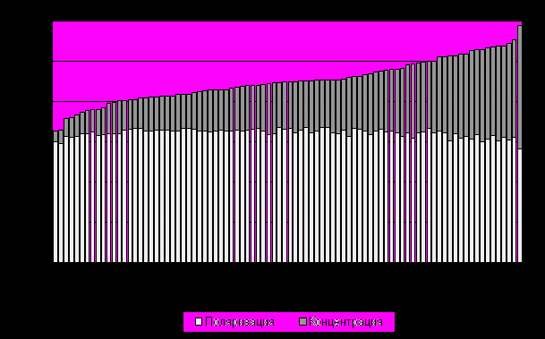 Рис. 5 показывает, что поляризация доходов внутри регионов России поразительно однородна и очень слабо убывает с увеличением неравенства, тогда как само это увеличение целиком обусловлено масштабами концентрации доходов: чем выше концентрация, тем выше неравенство.
