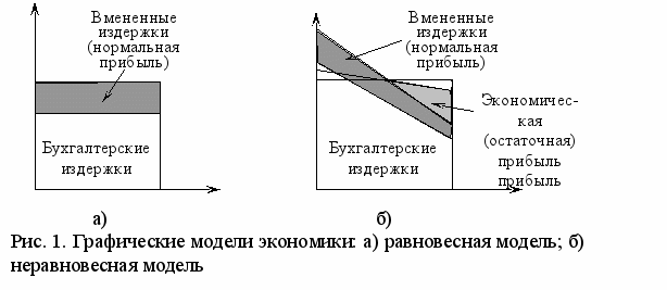 Объясняя парадокс, отметим, что здесь С.В.Брагинский и Я.А.Певзнер имеют в виду экономическую (остаточную), а не бухгалтерскую (балансовую) прибыль.3 Последняя в равновесной модели экономики вырождается в нормальную (естественную, общую, среднюю) прибыль (рис. 1а), не оставляя места для существования экономической прибыли. Отсюда и парадокс: в равновесии экономическая прибыль равна нулю. В то время как в реальной практике она неопровержимо существует. А в неравновесной модели она присутствует как в части нормальной прибыли, так и в части экономической прибыли (рис. 1б).