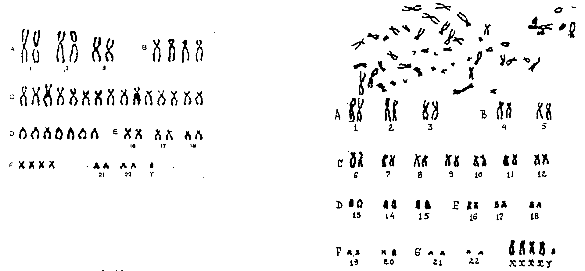 Рассмотреть и проанализировать кариограммы человека. Обратить внимание на группы хромосом с измененным числом. Записать кариотип и соответствующий диагноз.