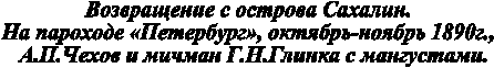 Московская жизнь после возвращения с Сахалина кажется Чехову скучной, и он едет в Петербург, откуда вместе с Сувориным отправляется в Европу, посещая многие европейские города. В Неаполе Чехов совершил восхождение на Везувий, а в Монте-Карло проиграл в рулетку 900 франков.