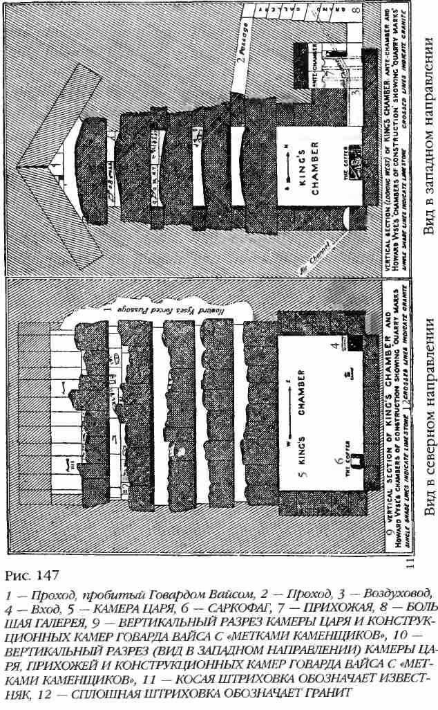 (Большинство египтологов без всяких дополнительных исследований приняли утверждение, что внутри Великой пирамиды написано имя Хуфу, однако работы сэра Алана Гардинера свидетельствуют, что у него имелись сомнения на сей счет. В своей книге «Egypt of the Pharaons» он воспроизводит царские картуши, на которых отчетливо видны различия между иероглифами «ра» и «х». Картуш Хеопса, писал он, «найден в различных каменоломнях, в гробницах его родственников и другой знати, а также в надписях последующих эпох». Отсутствие в этом списке Великой пирамиды вызывает подозрения... Кроме того, сэр Алан ничего не говорит об открытиях Вайса в третьей пирамиде, а также не упоминает самого имени Вайса.)