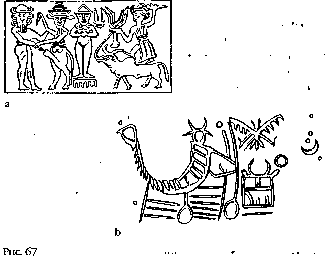 Древний текст не дает точного описания «небесного быка». Шумерский термин для его обозначения — ГУДАН.НА — может быть также интерпретирован как «атакующее оружие Ану», его «крылатая ракета». Древние художники, иллюстрировавшие этот эпизод, часто изображали сражение Энкиду и Гильгамеша с настоящим быком; за сражением обычно наблюдала обнаженная Иштар (иногда Адад). (Рис. 67а.) Однако из текста эпоса можно сделать вывод, что оружие Ану представляло собой механическое устройство из металла с двумя выступами («рогами») — «тридцать мин лазури их отливка, толщиною в два пальца их оправа». На некоторых древних рисунках изображен именно такой механический «бык», спускающийся с неба (рис. 67б).