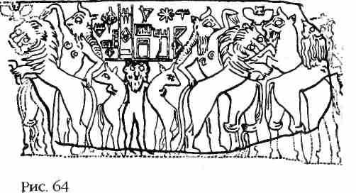 («Небесные Врата» — это весьма распространенный мотив изображений на ближневосточных цилиндрических печатях. Обычно они представляют собой крылатые, напоминающие лестницу ворота, ведущие к древу жизни. Иногда они охраняются змеями — рис. 72.)