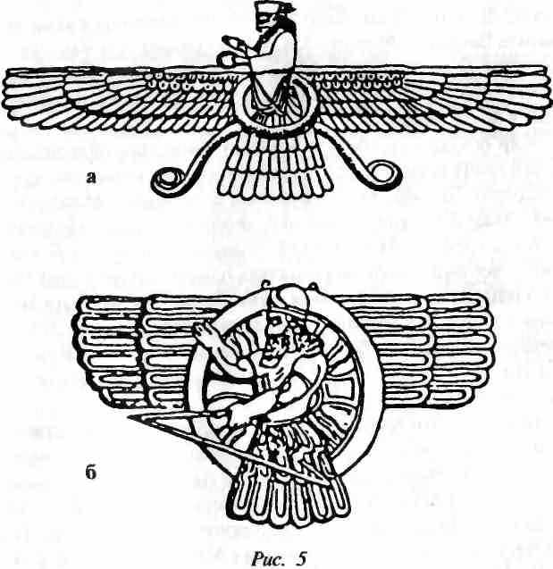 Кир оставил своим преемникам империю, объединившую в своих границах все прежние империи и царства, кроме одного. Шумер, Аккад, Вавилон и Ассирия в Месопотамии, Элам и Мидия на востоке, земли на севере; владения хеттов и греков в Малой Азии, Финикия, Ханаан и Филистия — все они теперь подчинялись одному суверенному царю и одному верховному божеству, Ахура-Мазде, Богу Истины и Света. На древних персидских рисунках (рис. 5а) он предстает бородатым богом, пересекающим небеса в Крылатом Диске — точно так же ассирийцы изображали своего главного бога Ашура (рис. 5б).