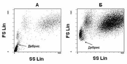 Для корректного исключения из зоны анализа всех частиц, которые не соответствовали по размерам и гранулярности живым лимфоцитам, вводили необходимые логические ограничения в гистограммы распределения частиц по малоугловому, боковому светорассеянию и CD45. Математическую обработку цитометрических данных проводили при помощи программ EXPO-32 и CXP v. 2.2 (Beckman Coulter, США). В каждой пробе анализировали не менее 104 клеток. Абсолютные значения получены как в одноплатформенной (с помощью реагента Flow Count (Beckman Coulter, США)), так и в двухплатформенной (с использованием результатов гематологического анализа) системах.