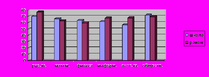 Из таблицы видим, что обученность выпускников 9-х классов по указанным общеобразовательным предметам в целом адекватна обученности выпускников района и области.