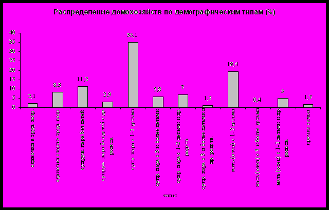 Как показывают результаты обследования, проведенного учеными Карельского научного Центра по заказу управления социальной защиты г.Петрозаводска и республиканского центра социальной помощи семье и детям «Сампо» в 2001 году в демографической структуре домохозяйств доминируют супружеские пары с 1-2 детьми, семьи состоящие из 3-4 человек (35,1%) , неполные семьи - мать (отец) с 1-2 детьми (19,4%) и супружеские пары без детей (11,25). Крупные семьи - 6 человек и более - 1,2%.