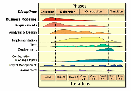 В отличие от каскадного подхода ( «водопада»), в RUP все дисциплины выполняются практически во всех фазах жизненного цикла ПС. Однако, в зависимости от фазы, меняются текущие цели проекта и соотношение между объемами работ, соответствующих различным дисциплинам.
