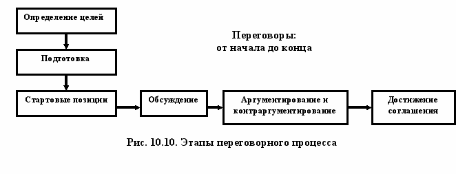 Правильная оценка этих параметров и их контроль гарантирует наилучшие результаты переговоров. Знание основных закономерностей процесса подготовки и ведения переговоров, использование наиболее эффективных техник (методов, приемов) общения обеспечивают успешность управленческой деятельности в целом (см. рис. 10.10. и 10.11.).