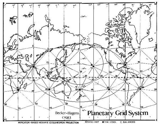 Из их проекта решетки можно видеть, что нынешняя структура континентов, цепи островов, горные хребты, океанические цепи гор и многое другое – все следует этому паттерну. При тщательном и внимательном изучении этой карты (о чем мы уже говорили в Сдвиге Эпох), можно видеть следующее: все выглядит так, как будто Земля представляет собой гибкий воздушный шар, окруженный решеткой. Если рассматривать решетку как набор проволочек, где проволочки являются силой, влияющей на шар, тогда можно видеть, как они толкают массивы суши в их нынешнее расположение.