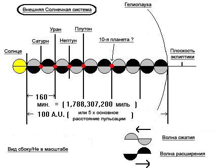 Когда Стоункинг выполнил эти вычисления, он обнаружил, что на каждом конце вычисленных им длин волн находится планета, что можно ясно видеть на рисунках. “Узлы” длин волны – это зоны наименьшего давления, где все вибрации взаимно гасятся и позволяют формирование планет. Более того, вся гелиосфера, формируемая магнитным полем Солнца, составляет ровно пять 160-минутных пульсаций.