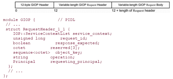 Заметьте, что если поменять местами описание полей в IDL – длина будет другой. Общая длина Message Body может зависеть и от порядка декларации параметров операции It is interesting to note that a structure of type CD does not always appear as a 16-byte value. Depending on the other data that precedes the structure on the wire, the length of the structure may vary. For example, consider the following operation, which accepts a string followed by a structure of type CD: interface foo { void op(in string s, in CD ds); }; When a client marshals a request to invoke op, it sends all the in parameters end-to-end according to CDR encoding rules. Assume for the moment that the parameters when sent inside the request begin at an 8-byte offset and that the client sends the string "Hello" as the value of the parameter s. Figure 13.2 shows the resulting encoding.