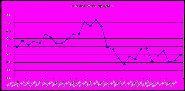 Таким образом, практически двукратное удвоение предложения за последние два года не поддерживается адекватным спросом. Скорее наоборот. По данным корпорации «Петербургская недвижимость» активность продаж за 2 года упала практически в два раза (см. ниже) с 11 % (в марте 2003 года) до 6% (в марте 2005 года).
