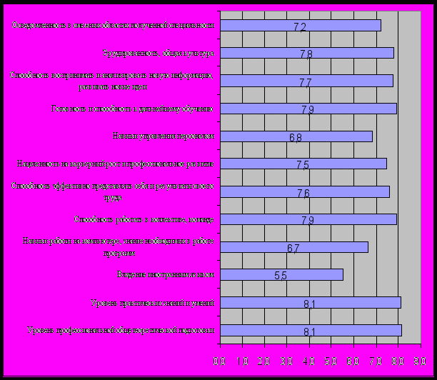 Руководители большинства предприятий и учреждений хотели бы получить молодых специалистов, имеющих современную теоретическую подготовку (82% выборки), владеющих практическими умениями и навыками (99%). Более 41% руководителей, принявших участие в опросе, заинтересованы в получении высококвалифицированных специалистов со знанием иностранного языка, которые смогут профессионально решать поставленные задачи. Под профессиональной пригодностью работодатели понимают набор конкретных характеристик, в частности – наличие профессиональной общетеоретической подготовки; владение базовыми знаниями и навыками (75%), владение практическими знаниями и умениями (99%), осведомленность в смежных областях полученной специальности (62%), и т.д. Многие руководители ожидают, что выпускники должны уметь воспринимать и анализировать новую информацию, развивать новые идеи (78%); 60% опрошенных желают получить сотрудников, знающих современное программное обеспечение и умеющих его применять на практике; около 52% из них заинтересованы в способностях выпускников академии управлять персоналом и работать в коллективе. Для 77% респондентов важно, чтобы молодой специалист был эрудирован и обладал общей культурой.
