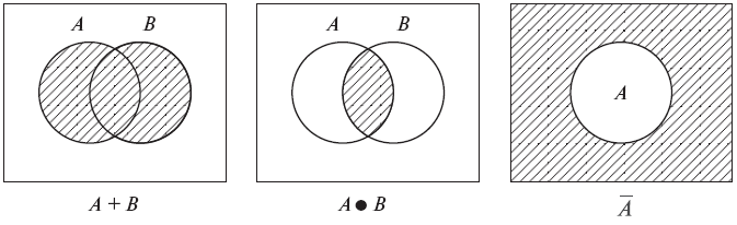 , що B є підмножиною А. Умовимось, що операцію об’єднання двох множин позначатимемо «+», а операцію перетину – «●». Стрічка над літерою означатиме унарну операцію знаходження додаткової множини, тобто множини елементів універсальної множини, які не входять у А. Для спрощення оперування з множинами можна використовувати діаграми Венна. Наприклад на мал. 1 вони приведені для об’єднання двох множин, перетину двох множин та додаткової множини до даної відповідно: