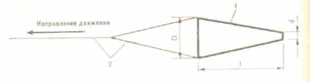 Рис. 3. Схема гидротормоза: 1 – пустой конус, 2 – крепление для буксировки гидротормоза (тонкий капроновый шнур)