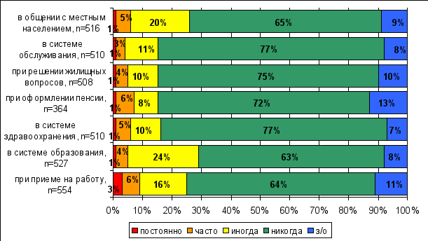 Чаще всего респонденты сталкиваются с ущемлением своих прав в системе образования, при общении с местным населением и при приеме на работу. Но, подчеркнем еще раз, что речь идет именно о редком столкновении с ущемлением своих прав. Доля респондентов, которые никогда не сталкивались с ущемлением своих прав в той или иной сфере колеблется от 63 до 77% в зависимости от ситуации. Более того, среди опрошенных 32% респондентов, которые сообщили, что никогда не сталкивались с ущемлением своих прав ни в одной из рассмотренных семи ситуаций.