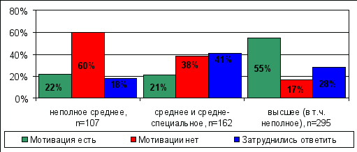 Довольно сильно на оценку мотивации к объединению русскоязычного населения влияет образование респондентов. Опрошенные русскоязычные граждане Румынии с высшим образованием в 55% случаев указывали на существование мотивации, в то время как среди респондентов со средним и неполным средним таких только 21-22%. При этом в группе респондентов с неполным средним образованием 60% считают, что у русскоязычного населения Румынии мотивации к объединению нет (Рис. 3.31).