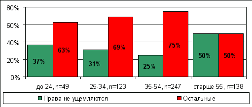 - возрастом (только 25% респондентов в возрасте от 35 до 54 лет говорят, что права их не ущемляются ни в одной из предложенных ситуациях);