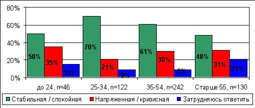 - возраст респондента (70% респондентов в возрасте от 25 до 34 лет оценили ситуацию как стабильную или спокойную);
