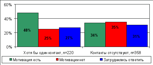 Другим значимым фактором, влияющим на оценку мотивации к объединению русскоязычного населения Румынии является факт наличия/отсутствия контактов с представителями России (родственники, друзья, деловые контакты). Респонденты, у которых есть хотя бы один из указанных контактов с гражданами России склонны давать позитивные оценки относительно существования мотивации к объединению (48%). Те, у кого связи с Россией отсутствуют, скорее указывают на отсутствие мотивации к объединению (Рис. 3.34).