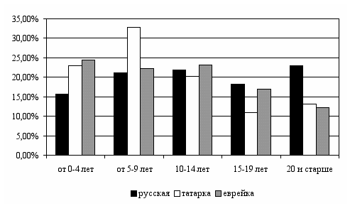 бращает внимание на себя большая доля детей в возрасте 5–9 лет у матерей татарок (рис. 11). Это предположительно связано с возрастной структурой татарского населения города. (рис. 12) Из-за того, что в 1970 г. велика возрастная группа «30–34 г.» (возможно она сформировалась за счет мигрантов), представители этой группы могут выступать как родители детей 5–9 лет.