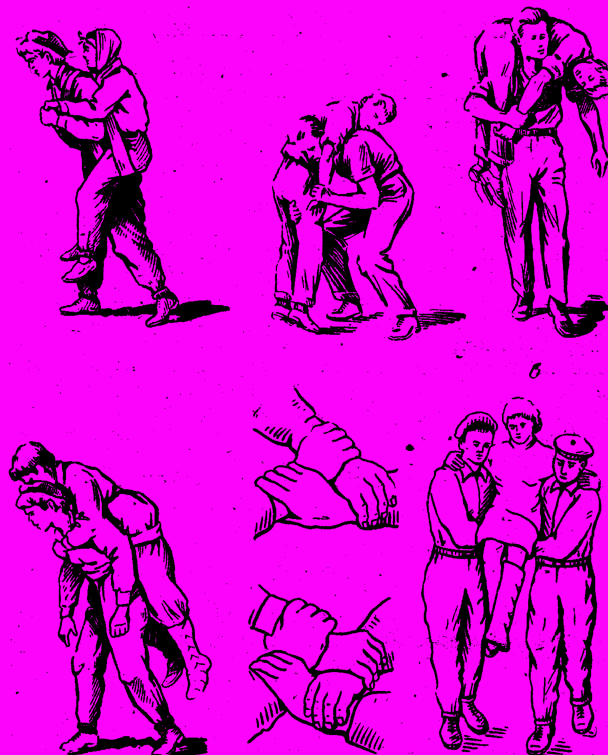 Один із надійних засобів перенесення ураженого - на лямці, складеної каблучкою або вісімкою. При відсутності лямки ураженого можна винести на спині або на руках - засобом «замком із трьох рук» або «замком із чотирьох рук» .