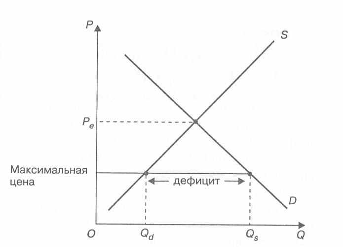 Не редко можно встретиться и с установлением верхнего придела цены (ценовым потолком). Если верхний придел цены установлен выше рыночной, то никаких серьёзных изменений не произойдёт, но верхний придел цены устанавливается для ограничения роста цены и устанавливается ниже цены рыночного равновесия. Как правило, это делается для поддержания беднейших слоёв населения и для установления справедливости распределения товара. Например, во время войны или голода правительство может устанавливать максимальные приделы цен на основные товары для того, чтобы бедные слои населения могли приобрести их. При уменьшении цены уменьшается и предложение, но спрос при этом возрастает а, следовательно, возникает дефицит. Складывающаяся ситуация на рынки изображена на Рис.2.