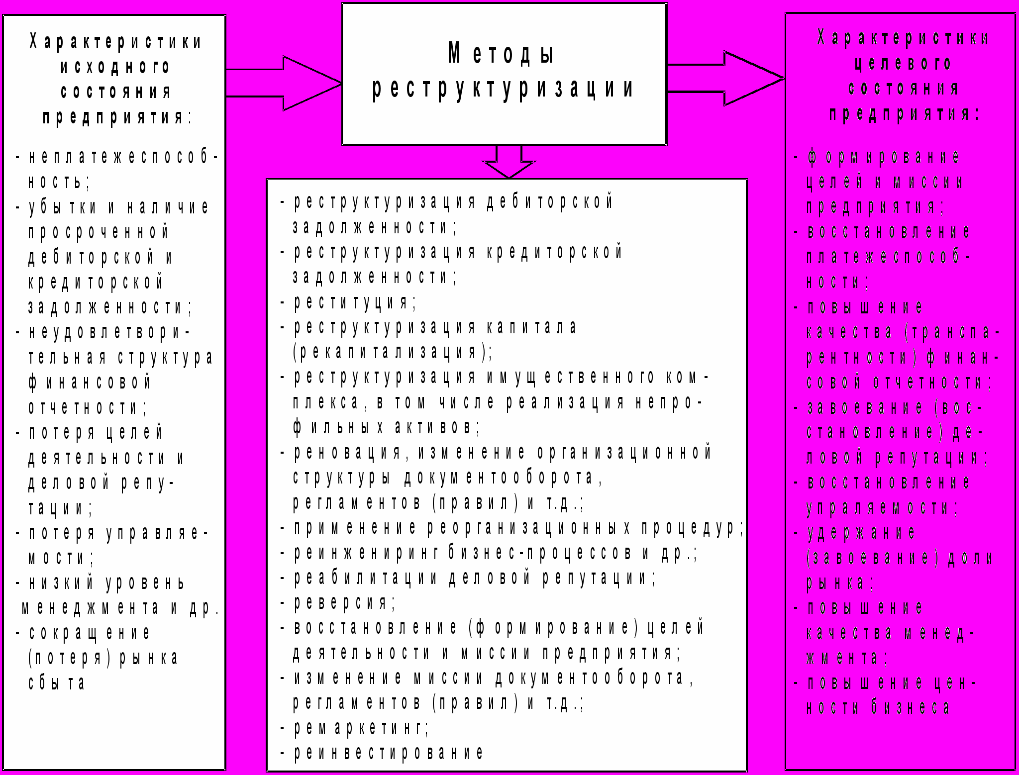 Восстановление функций и платежеспособности предприятия возможно только при использовании комплекса инструментов антикризисного управления. Особым инструментом антикризисного управления является наиболее радикальный способ реформирования предприятия – реструктуризация. С одной стороны, реструктуризация является элементом управления любым развивающимся предприятием, с другой, – инструментом антикризисного управления, направленного на финансовое оздоровление предприятия, осуществление организационно-экономических и технологических преобразований. Реструктуризация в авторской интерпретации представляет собой комплексный процесс изменения структуры активов, капитала и обязательств предприятия и его организационной структуры, целью которого является его финансовое оздоровление.