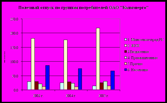 Так, за период с 1991 г. по 2004 г. отпуск электроэнергии собственным потребителям снизился с 931 млн. кВтч. до 338,9 млн. кВтч (в 2,7 раза на 592,1 млн. кВтч.), причем наибольшее снижение отмечено по группе «Сельскохозяйственные потребители».