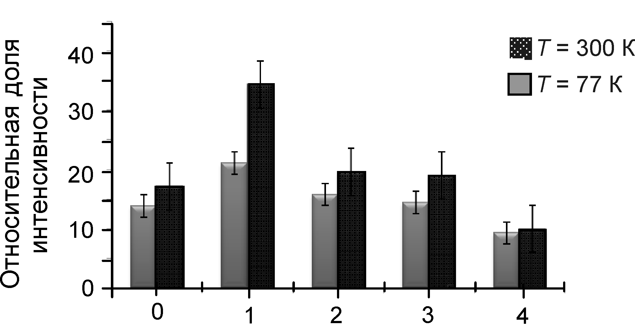 Как видно из гистограммы, при низкой температуре (77 К) значительно увеличивается интенсивность подспектра, соответствующего окружению атома железа с одним атомом примеси. Как правило, увеличение доли окружений с одним атомом хрома связывают с процессом ближнего атомного упорядочения в твердом растворе, связанным с перераспределением атомов [4, 5]. Поскольку перераспределение атомов в твердом растворе при снижении температуры маловероятно, то увеличение относительной доли интенсивности подспектра с одним атомом примеси в ближайшем окружении железа наиболее естественно связать с увеличением вероятности эффекта Мессбауэра, что обусловлено увеличением взаимодействия между атомами в данной конфигурации.