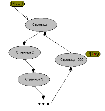 Другой эффект при d=1, если мы кольцом перелинкуем 1000 страниц, при этом других ссылок на этих страниц не будет, и на одну из этих страниц будет ссылка с большим весом, то у всех страниц будет одинаково большой вес. Например у нас есть тысячу страниц С1, С2, …,С1000 и мы покупаем ссылку со страницы С0 с большим весом, скажем PR 9 на страницу С1. C0 ссылается на С1, С1 на С2, С2 на С3 … С999 ссылается на С1000, С1000 на С1. Причем других ссылок с этих страниц нет. У всех страниц будет одинаково большой вес (PR=9), даже если не учитывать, что у нулевой страницы вес не равен 0, а он мал, но существует. Поэтому с проходом по ссылкам вес будет только увеличиваться. Это не так, поскольку d=0.85.