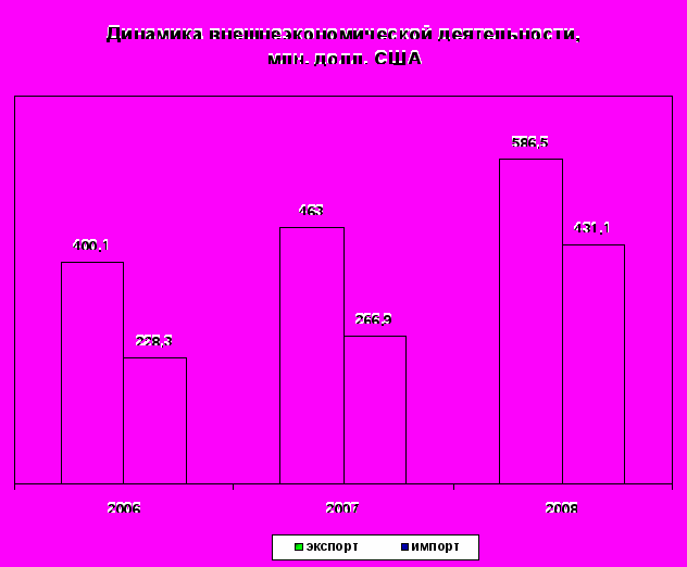 Объемы экспорта товаров в Автономной Республике Крым за 2008 год составили 586,5 млн. долл. США, импорта – 431,1 млн. долл. США. По сравнению с соответствующим периодом 2007 года экспорт увеличился на 26,7 %, импорт – в 1,6 раза. Положительное сальдо внешней торговли товарами составило 155,4 млн. долл. США (рисунок 5).