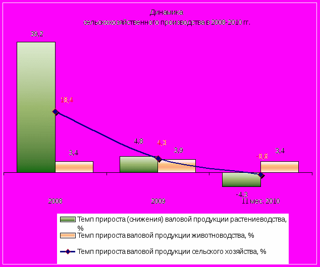 В январе-ноябре 2010 года по сравнению с аналогичным периодом прошлого года объем производства сельскохозяйственной продукции в сопоставимых ценах снизился на 0,6%.