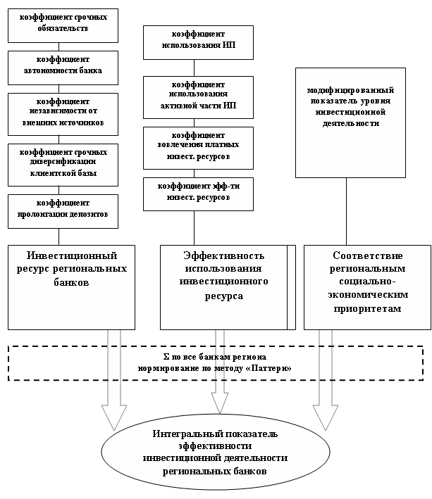 ные сценарии привлечения и размещения средств. При этом оценка стоимости того или иного источника средств хотя и является важным, но не самым главным при формировании оптимальной величины инвестиционного потенциала банка. Все это требует более детального рассмотрения возможностей реализации инвестиционного потенциала банка, что позволит не только получить определенный экономический эффект для самой кредитной организации, но и даст дополнительный импульс развития всей инвестиционной сферы. Для проведения таких исследований разработан интегральный показатель уровня эффективности инвестиционной деятельности региональных банков (рис.3).